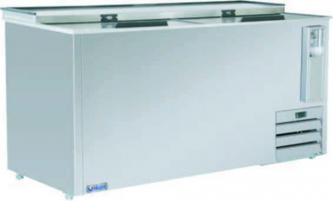 IKON Refrigeration Bottle Cooler, flat top, 17.2 cu. ft. capacity, 64-3/10"W x 27"D x 35"H, deep well, stainless steel top with rear raised glass rails, (2) sliding lids (lockable), electronic thermostat, 33° to 41°F temperature range, digital LED temperature display, (3) bin dividers, bottle opener with cap catcher, stainless steel interior & exterior, side mounted self-contained refrigeration, R-600A refrigerant, 1" wheels, 1/2 hp, 115v/60/1-ph, 3 amps, cord with NEMA 5-15P, cETLus, ETL-Sanitation