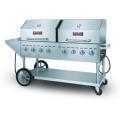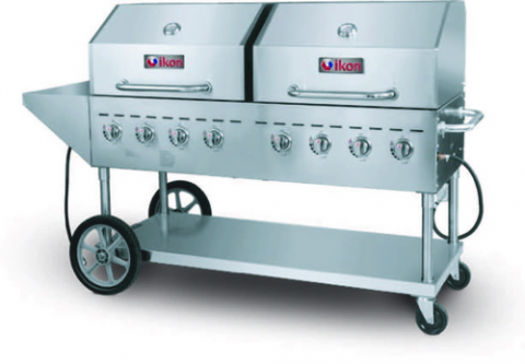 IKON Cooking Outdoor Gas Grill, LP gas, 80-5/16"W, (2) 27-4/5" x 21-3/10" cooking areas, (8) stainless steel tube burners, stainless steel radiants, side shelf, (2) roll domes, removable drip pan & rack carriage assembly, 120,000 BTU, 304 stainless steel construction, (2) lockable casters & (2) 14" wheels, cETLus