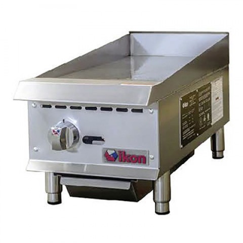 IKON Cooking Griddle, natural gas, countertop, 12" W x 34.4" D, adjustable manual control, front lit pilot light, (1) 30,000 BTU U-shape burners, 3/4" polished steel griddle plate, (1) gas control knobs, double wall insulated sides, welded back & side splash guards, rear flue, removable 3-1/4" grease drawer with weep hole & baffle, 4" wide grease trough, stainless steel cabinet, stainless steel adjustable legs, non-skid feet, 30,000 BTU total, CSA-Sanitation, CSA Star, CSA Flame (ships with LP gas conversion kit)