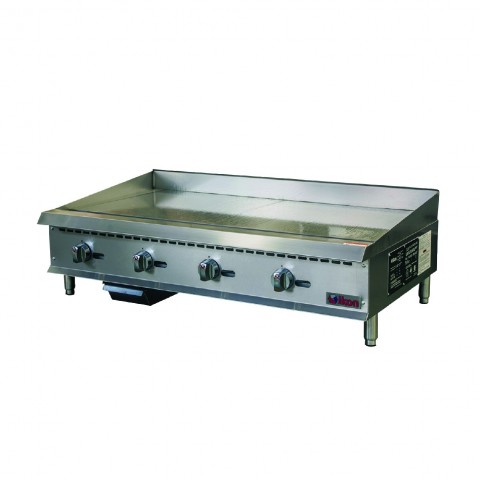 IKON Cooking Griddle, natural gas, countertop, 48" W x 34.4" D, adjustable manual control, front lit pilot light, (4) 30,000 BTU U-shape burners, 3/4" polished steel griddle plate, (4) gas control knobs, double wall insulated sides, welded back & side splash guards, rear flue, removable 3-1/4" grease drawer with weep hole & baffle, 4" wide grease trough, stainless steel cabinet, stainless steel adjustable legs, non-skid feet, 120,000 BTU total, CSA-Sanitation, CSA Star, CSA Flame (ships with LP gas conversion kit)