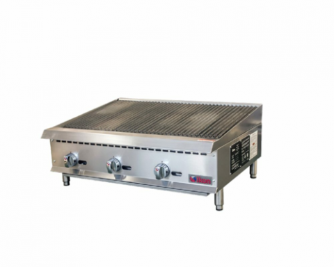 IKON Cooking Radiant Broiler, LP gas, 36" W x 34.4" D, (3) 35,000 BTU 'U' shape burners, 10 gauge cast iron radiants, rear flue, adjustable manual controls, 3-position cast iron grates, front lit pilot light, double wall insulated sides, back & side splash guards, removable full width crumb tray, rear gas regulator, stainless steel cabinet, adjustable stainless steel legs, non-skid feet, 105,000 BTU total, CSA-Sanitation, CSA Star, CSA Flame (ships with natural gas conversion kit)