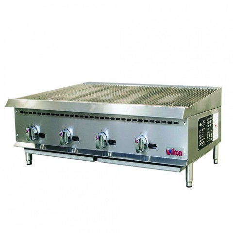 IKON Cooking Radiant Broiler, natural gas, 48" W x 34.4" D, (4) 35,000 BTU 'U' shape burners, 10 gauge cast iron radiants, rear flue, adjustable manual controls, 3-position cast iron grates, front lit pilot light, double wall insulated sides, back & side splash guards, removable full width crumb tray, rear gas regulator, stainless steel cabinet, adjustable stainless steel legs, non-skid feet, 140,000 BTU total, CSA-Sanitation, CSA Star, CSA Flame (ships with LP gas conversion kit)