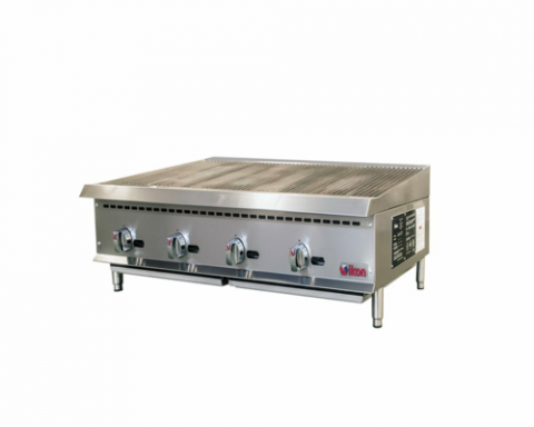 IKON Cooking Radiant Broiler, LP gas, 48" W x 34.4" D, (4) 35,000 BTU 'U' shape burners, 10 gauge cast iron radiants, rear flue, adjustable manual controls, 3-position cast iron grates, front lit pilot light, double wall insulated sides, back & side splash guards, removable full width crumb tray, rear gas regulator, stainless steel cabinet, adjustable stainless steel legs, non-skid feet, 140,000 BTU total, CSA-Sanitation, CSA Star, CSA Flame (ships with natural gas conversion kit)