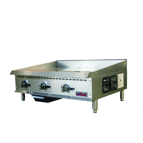 IKON Cooking Griddle, natural gas, countertop, 36" W x 34.4" D, adjustable manual thermostatic control, front lit pilot light, (3) 30,000 BTU U-shape burners, 1" thick polished steel griddle plate, (3) gas control knobs, double wall insulated sides, welded back & side splash guards, rear flue, removable 3-1/4" grease drawer with weep hole & baffle, 4" wide grease trough, stainless steel cabinet, stainless steel adjustable legs, non-skid feet, 90,000 BTU total, CSA-Sanitation, CSA Star, CSA Flame (ships with LP gas conversion kit)