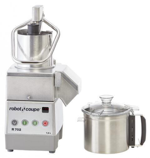 R702 READY - Commercial Vegetable Prep Machine, 7.5 liter stainless steel bowl with handle, continuous feed kit with kidney shaped & cylindrical hopper, includes: 3mm (1/8") grating & 3mm (1/8") slicing disc, two speeds, 900 & 1800 RPM, 208-240v/60/3-ph, 5.8 amps, 2.4 HP, NEMA L15-20P, cETLus, ETL-Sanitation