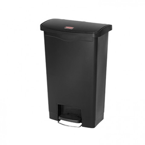 Slim Jim® Utility Container, 13 gallon (50 liter), 17-31/32"W x 11-31/64"D x 28-19/64"H, slim profile, internal hinged lid, includes: liner retainer band, front step-on pedal, small footprint, indoor, resin, black, FM approved, meets OSHA & OBRA standards (dual rigid stream liner sold separately), Made in USA (16 week lead time)
