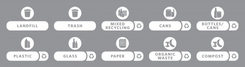 Slim Jim® Recycling Label Kit Version C, includes (1) each mixed recycling, paper, plastic, glass, cans, bottles/cans, compost, organic waste, landfill and trash labels, fits 32 & 44 gallon BRUTE® containers, Made in USA