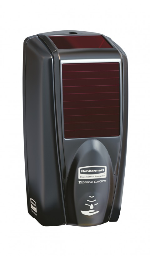 AutoFoam Soap Dispenser, touch-free, with LumeCel™ rechargeable energy cells (stores energy from lighting), holds 1100mL foam soap or sanitizer, controlled dispensing, LUX Detector (determines sufficient lighting), refill indicator, black & black pearl finish, CE