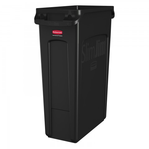 Slim Jim® Container, 23 gallon, 22"W x 11"D x 30"H, with venting channels, molded-in handles, general purpose waste, open type without lid, high-impact plastic construction, black, Made in USA