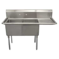 Economy Series Sink, two compartment, 74-1/2"W x 29-1/2"D x 45-1/2"H, 18/304 stainless steel, (2) 24" wide x 24" front-to-back x 14" deep compartments, 24" drainboards on right &, 11-3/4"H backsplash, 8" OC splash mount faucet holes, raised rolled edges on front & sides, 3-1/2" basket drains with 1-1/2" outlets, stainless steel gussets, galvanized steel legs with adjustable bullet feet, NSF