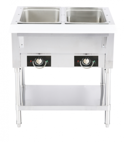 Serv-Ware Electric Steam Table, 2 Open Wells, 44"W x 29.5"D x 33.5"H overall dimensions, temperature range 120°F–200°F, 115v/60/1, 12.5 Amps, 1500 Watts, stainless steel construction, 1 Year Parts & 90 Days Parts & Labor warranty.