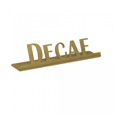 Table Sign, "Decaf", 1"H x 4"W, laser-cut, dishwasher safe (hand washing is recommended), stainless steel, vintage gold, Made in USA