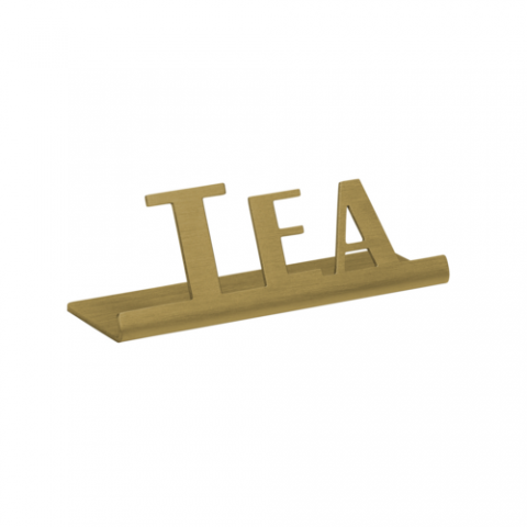 Table Sign, "Tea", 1"H x 3-1/2"W, laser-cut, dishwasher safe (hand washing is recommended), stainless steel, vintage gold, Made in USA