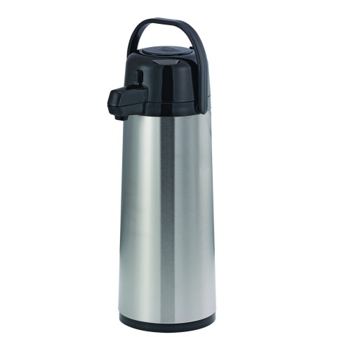 Eco-Air® Airpot, 2.5 liter (84.5 oz.), 6" x 8" x 17", retention: 6-8 hours, smooth body, glass liner, pump style, black lid, vacuum insulated, hand wash (do not submerge), stainless steel, brushed, NSF (Priced per each, packed 6 each per case)