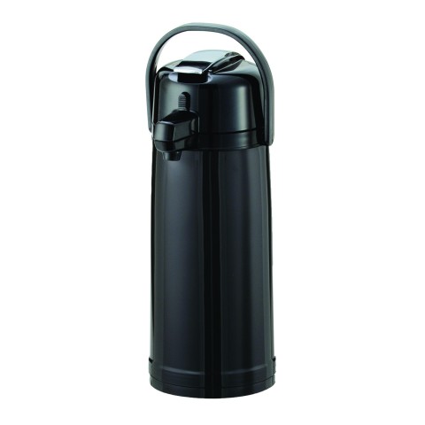 Eco-Air® Airpot, 2.2 liter (74.4 oz.), 6" x 8" x 16", retention: 6-8 hours, smooth body, glass liner, lever style, black lid, vacuum insulated, hand wash (do not submerge), plastic, shiny black, NSF (Priced per each, packed 6 each per case)