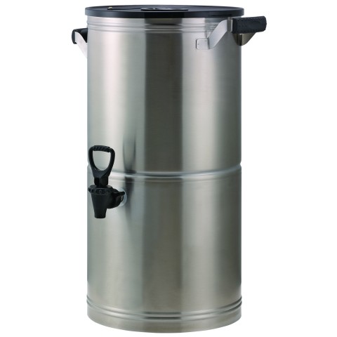 Tea Dispenser, 5 gallon (640 oz.), 15-1/4" x 14-1/4" x 21-3/4", round, single wall, includes: black plastic brew-thru lid, gravity fed spigot, and includes flavor indicator labels, hand wash only, cold beverages only, ergonomic handles, stainless steel, brushed finish, NSF (Priced per each, packed 6 each per case)