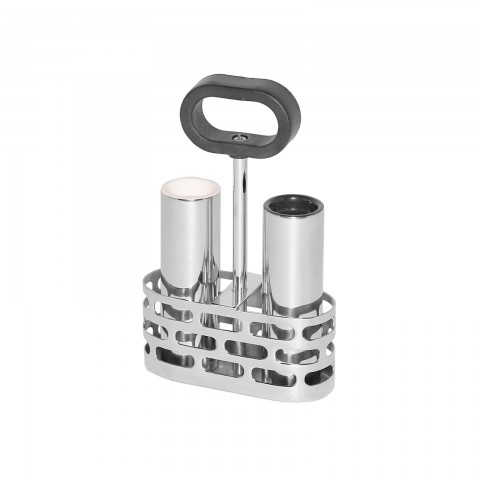 Mod18 Steelworks Salt & Pepper Shakers Set, with rack, 6-1/4" H x 1-1/4" dia., cylindrical shakers, colored tops, includes caddy with silicone handle, dishwasher safe, 18/8 stainless steel, polished finish (to be discontinued, contact factory for availability) (Priced per each, packed 24 each per case)