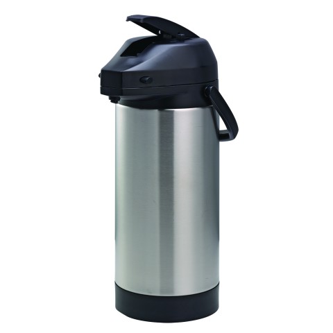 Lock 'N' Carry Airpot, 3.8 liter (128.5 oz.), 6-1/4" x 9" x 16-3/4", retention: 4-6 hours, smooth body, double wall, black lid with locking mechanism, vacuum insulated, lever style, hand wash (do not submerge), 18/8 stainless steel, brushed finish, NSF (Priced per each, packed 6 each per case)