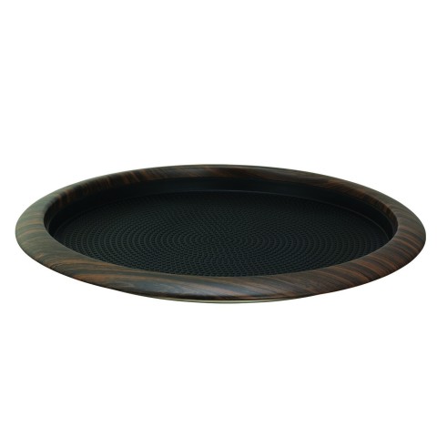 Natural Elements Tray, 14" dia. (12" dia. inside), round, stackable, removable silicone rubber insert, non-slip, hand wash only, 18/8 stainless steel, dark wood (Priced per each, packed 12 each per case)