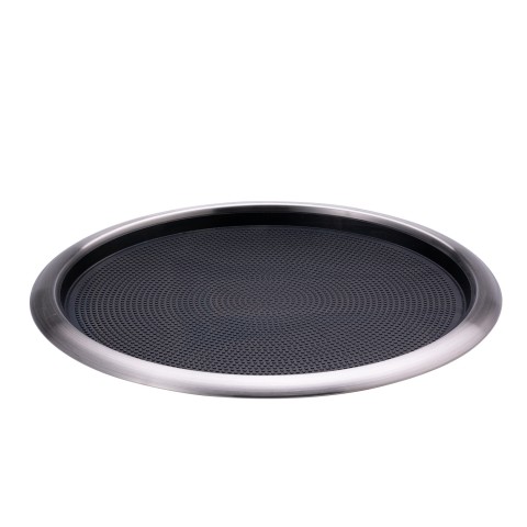 Tray, 16" dia. (14" inside), round, stackable, removable silicone rubber insert, non-slip, dishwasher safe, 18/8 stainless steel, brushed finish (Priced per each, packed 12 each per case)