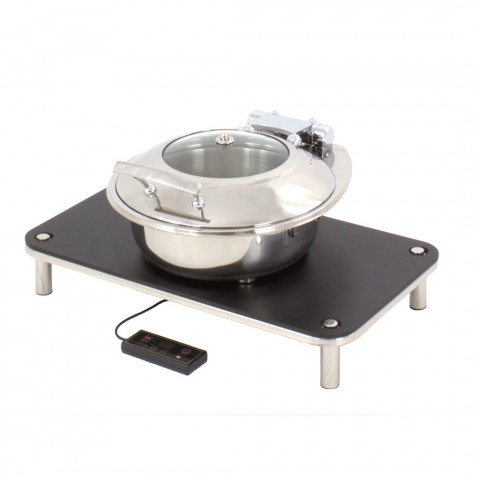 Domino Smart W Chafer Induction Set, medium, includes: (1) SMART medium round stainless steel chafing dish with glass lid (1A15303) (1) domino large tray stand (1A19406090) (1) rectangle induction black phenolic platform with magnets (1ARECP) (1) induction warmer (1AIW110AC) 18/10 stainless steel, polished finish