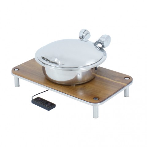 Domino Smart W Chafer Induction Set, medium, includes: (1) SMART W medium round stainless steel chafing dish (1A15705) (1) domino large tray stand (1A19406090) (1) rectangle induction wood platform with magnets (1A19406TDR) (1) induction warmer (1AIW110AC) 18/10 stainless steel, polished finish
