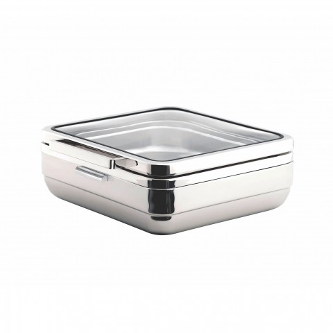 T-Collection Chafing Dish, 5-4/5 qt. (5-1/2 liter), 17"L x 15-1/2"D x 7"H, square, induction ready, full glass self-closing hinged lid, insulated handle, includes: 2/3 oblong food pan, bolt & screw assembly, 18/10 stainless steel, polished finish, with removable stainless steel accent band
