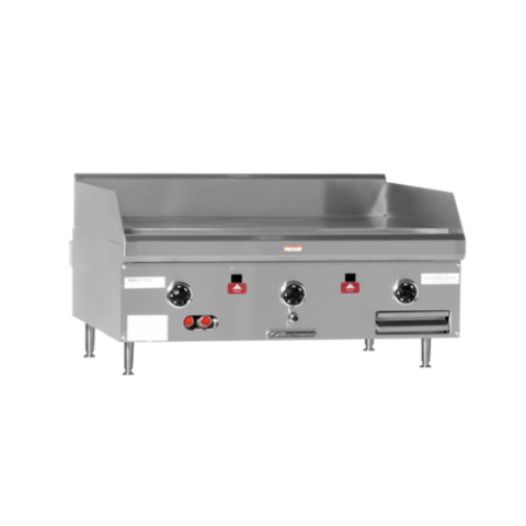 Griddle, floor model, gas, 24" W x 30" D cooking surface, 1" thick polished steel plate, (2) burners, thermostatic controls, battery spark ignition, flame failure safety device, stainless steel front & sides, 4” adjustable legs, 60,000 BTU, CSA, NSF