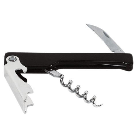 Waiter's Cork Screw, 4-3/8"L, curved nickel-plated multi-functional corkscrew, knife, and bottle opener, with black plastic handle, packed 1 dz/ctn