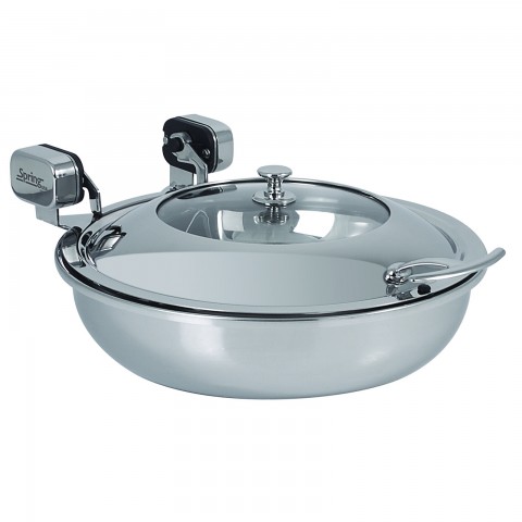 Vision Induction Buffet Server, 14.17" dia. x 7.11"H, (36 cm), round, holds: 1-1/4 qt., 2-1/2 qt. & 4 qt. inserts, hinged stainless steel cover with clear view glass area, "All-Angles" axle system, 18/10 stainless steel with chrome accents (insert pans must be ordered separately) (Stock Item)