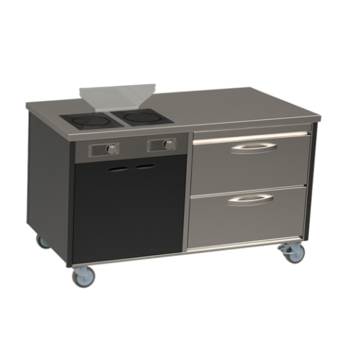 Mobile Culinary Station, 64"W x 33"D x 47.65"H, welded 430 stainless steel cabinet with black laminated panels, black corner trim, 200 series stainless worktop; heavy-duty 5" swivel casters (2 with brakes); dual integrated SM-261R induction ranges with SmartScan technology, pan detection, 20 power levels, 5mm tempered glass cooktop, solid-state controls, knob-set thermostats, temperature range 100°F–400°F; integrated BlueAir BLUR28-D2-HC 2-drawer refrigerator with hermetically sealed compressor, finned evaporator and condenser, accepts standard food pans; AF350 downdraft air filtration with stainless capture flue, quiet blower, 3-stage washable filters (96.7% at 1–3 microns); PM-2231 cabinet-mounted power management system with stainless enclosure and hardware, single-point connection, 6 ft cord, surge-protected outlets, NEMA 14-50R receptacle; plug-and-play appliance connection; 6.03kW, 35A, NEMA 14-50P, 208-220V/60Hz/1ph, ETL, UL STD 197, CSA C22.2 #109, CSA C22.2 #120, UL 471, ENERGY STAR®