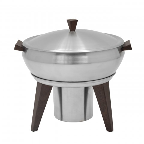 Skyra™ Wynwood Induction Chafing Dish, 2.5 qt., 10" dia. x 11"H, round, with insert, lift-off lid, fuel holder & display stand, brushed stainless steel, waterproof wood finish legs (Stock Item)