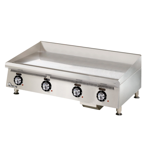 Ultra-Max® Griddle, countertop gas, 60" W x 24" D cooking surface, 1" thick T1 steel hexavalent chrome griddle plate, 150° - 550° F embedded mechanical snap-action thermostat every 12", 4-3/8" tapered wrap-around splash guard, 3-1/2" front grease trough, heavy-duty metal knobs, standing pilot, welded steel frame with stainless steel exterior, 4" stainless steel legs with 1-3/8" adjustment, 150,000 BTU, cULus, UL EPH Classified, Made in USA