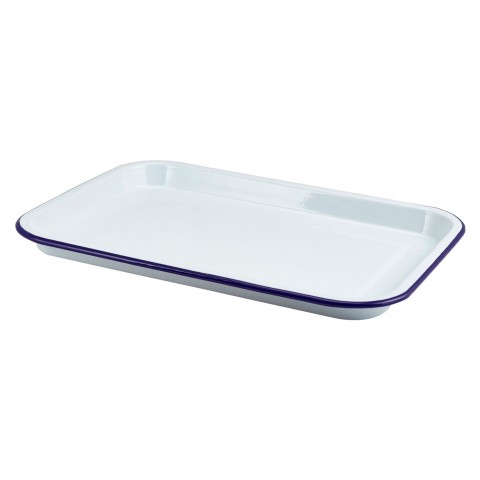 Serving Tray, 13-1/4"L x 9-1/4"W x 7/8"H, rectangular, dishwasher & oven safe, enamelware, white with blue rim, Genware London, GW Enamel (minimum = case quantity) (stock item) (6 each per case)