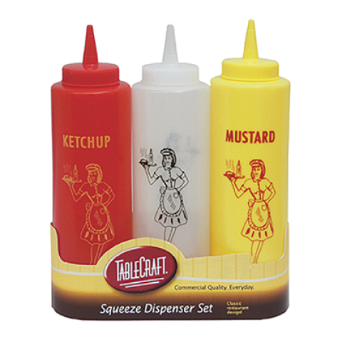 Cash & Carry Nostalgia Squeeze Bottle Set, 12 oz., 3-piece set includes: (1) 1112K, (1) 1112M, (1) 1112C, dishwasher safe, cone tip, soft polyethylene PerfectFlex™, Made in USA (must be purchased in multiples of 12 sets)