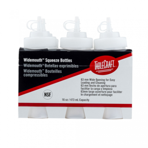 Cash & Carry WideMouth™ Squeeze Bottle, 16 oz., 63mm opening, natural cone tip, tethered cap, dishwasher safe, soft polyethylene, clear, NSF (6 per pack) (8 pack minimum order)