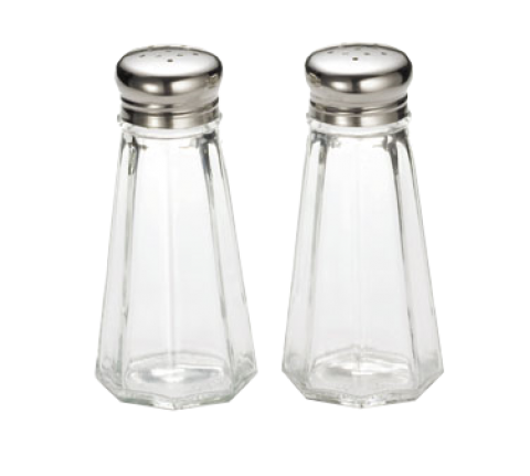 Salt/Pepper Shaker, 3 oz., paneled glass, dishwasher safe, stainless steel tops (fits rack model numbers 606R & 606RBK) (must be purchased in multiples of 24 each)