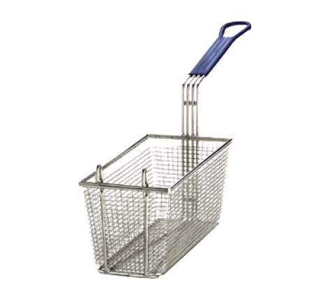 Fry Basket, 25-1/2" x 5-3/4" x 5-3/4", rectangular, mesh, blue cool-to-touch PVC handle, hand wash only, nickel plated (1 each minimum order)
