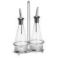 Siena™ Oil and Vinegar Set, (2) 6 oz. clear glass bottles (dishwasher safe), stainless steel pourers (hand wash only), chrome plated rack (hand wash only) (1 set minimum order)