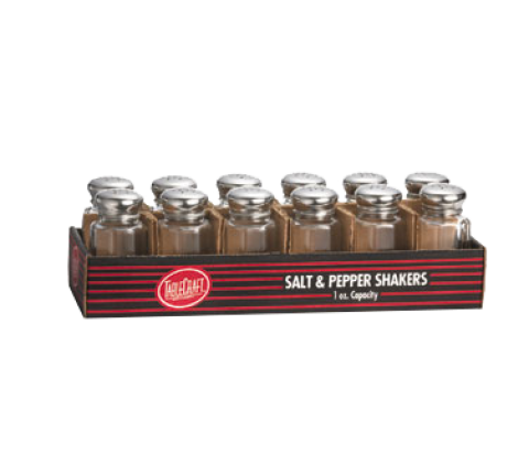 Cash & Carry Salt/Pepper Shaker, 1 oz., 1-1/2" dia., paneled glass, dishwasher safe, stainless steel tops (display merchandise pack, 12 per pack) (must be purchased in multiples of 4 packs)