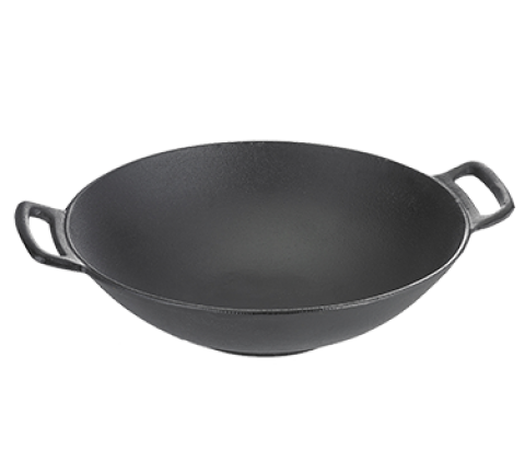 Wok, 6 qt., 14" dia. x 3-5/8", (17-1/2" O.A.L) round, with 2 handles, pre-seasoned, hand wash only, induction ready, cast iron (1 each minimum order)