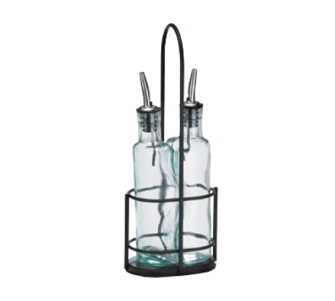 Cash & Carry Gemelli™ Bottle Set, (2) 8-1/2 oz. embracing green tint glass bottles (dishwasher safe), stainless steel pourer (hand wash only), black powder coated metal rack (hand wash only) (must be purchased in multiples of 6 sets)