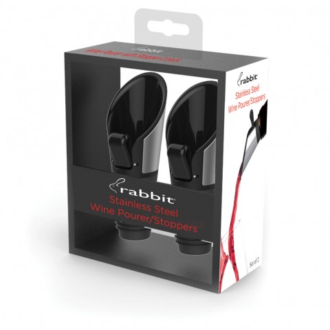 Rabbit® Flipper Pourer/Stopper, air-tight wine stopper (flip to close), drip free pourer (flip to open), fits all bottle sizes, dishwasher safe, stainless steel, set of 2 (must be purchased in case quantities)