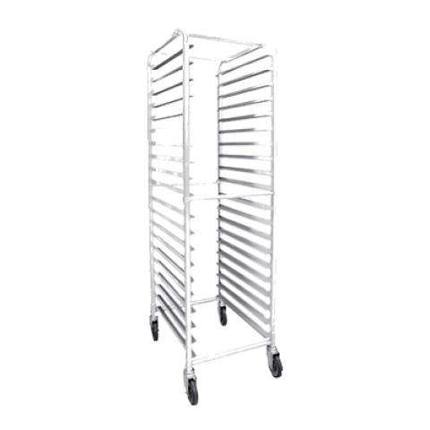Bun Pan Rack, 20-1/4"L x 26"W x 69-1/4"H end load, round top design, holds 20 full size or 40 half-size pans, crossbars, aluminum tubing, (4) 5" swivel casters (2-locking), NSF (assembly required)