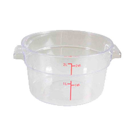 Food Storage Container, 2 quart, round, shatter and scratch resistant, -40° to 210° F temperature range, polycarbonate, clear, NSF (12 each minimum order)