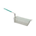 Fry Basket, 13" x 6-5/8" x 5-1/8", rectangular, front hook, wire mesh, green handle, nickel plated