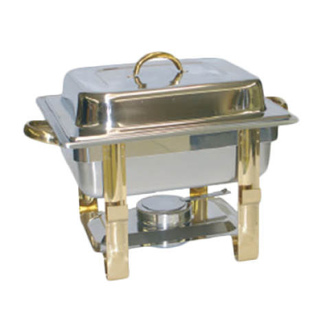 Chafer, 4 quart, half-sized, rectangular, dripless water pan, fuel holder and plate, gold handles and supporting legs, stainless steel