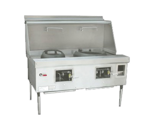 EcoDeck Wok Range, gas, (3) chamber, waterless (no constant flow of cooling water required), ball valve & push button activated water wash bar, Chinese swing faucet, L-shaped gas valve handle per burner, stainless steel 8" work/plating shelf, 5" front access integral with sink, 3-pipe rack, removable strainer basket, drip trays, legs with adjustable bullet feet, ETL, NSF