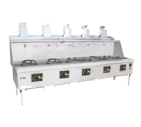 York® Wok Range, Gas, (5) chambers, fiber ceramic insulation, (5) high flue risers, water cooled top, Chinese swing faucets, knee "L" lever gas handle, black epoxy coated sides, ETL, NSF