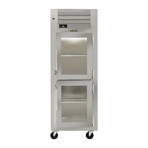 Spec-Line Refrigerator, Reach-in Display, one-section, 19.1 cu. ft., self-contained refrigeration, stainless steel exterior & interior, shallow depth, wide half-height glass doors, interior lights, (3) adjustable wire shelves per section, microprocessor controls, 6" adjustable stainless steel legs, R-290 Hydrocarbon refrigerant, 1/3 HP, 115v/60/1-ph, 7 amps, cETLus, ETL-Sanitation, ENERGY STAR®